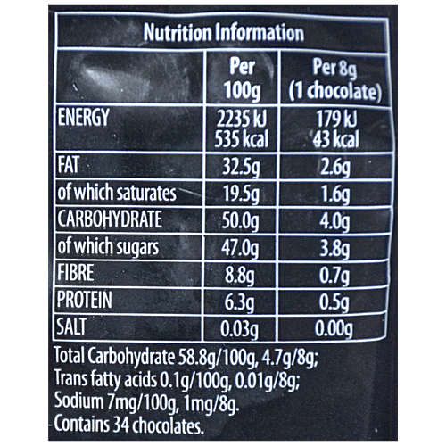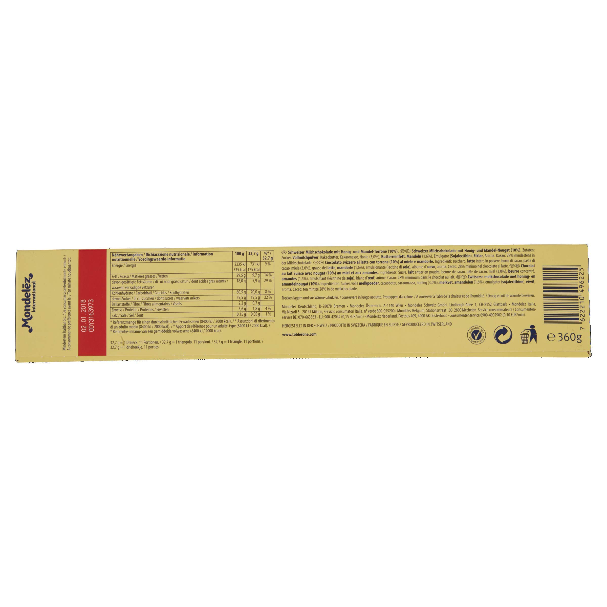 Toblerone Dark Chocolate, Swiss, with Honey and Almond Nougat Nutrition Serving Size: 1.16 oz (s) - 33 g Amount per Serving My Daily Value Calories 180 Kcal 11% Total Fat 10 g 16% Saturated Fat 6 g 35% Trans Fat 0 g 0% Cholesterol 3 mg 1% Sodium 0 mg 0% Total Carbohydrate 20 g 9% Dietary Fiber 2 g 8% Sugars 15 g 21% Added Sugars 15 g 62% Protein 2 g 4% Vitamin A 0 mcg 0% Vitamin C 0 mg 0% Calcium 0 mg 0% chocolate bar milk - Toblerone - 360 g Ingredients. → Ingredients are listed in order of importance (quantity). Ingredients list: sugar, whole milk powder, cocoa butter, cocoa mass, honey (3,0%), milk fat, almonds (1,6%), emulsifier ( soya lecithin ), egg white, flavouring, milk chocolate: cocoa solids 28% minimum, milk solids 14% minimum, Substances or products causing allergies ... Toblerone Fruit & Nut Chocolate Large Bar on CHOMP Is Toblerone Fruit & Nut Chocolate Large Bar Vegan, Vegetarian, or Gluten-Free? We checked the ingredients and have the answer! Toblerone Fruit & Nut Chocolate Large Bar reviews, nutrition label, product images, allergens, trace ingredients, and more. Made by Toblerone. Barcode 7622210496621. Toblerone Chocolate (50gm) | The Food Citi 2000 calories a day is used for general nutrition advice. Storage Condition: Keep Toblerone Chocolate refrigerator. Disclaimer: The products details, information, ingredients, nutritional guides and dietary/allergy may change continually thus we recommend reading the products label. Bulk discounts shown are subject to continuous price changes ...
