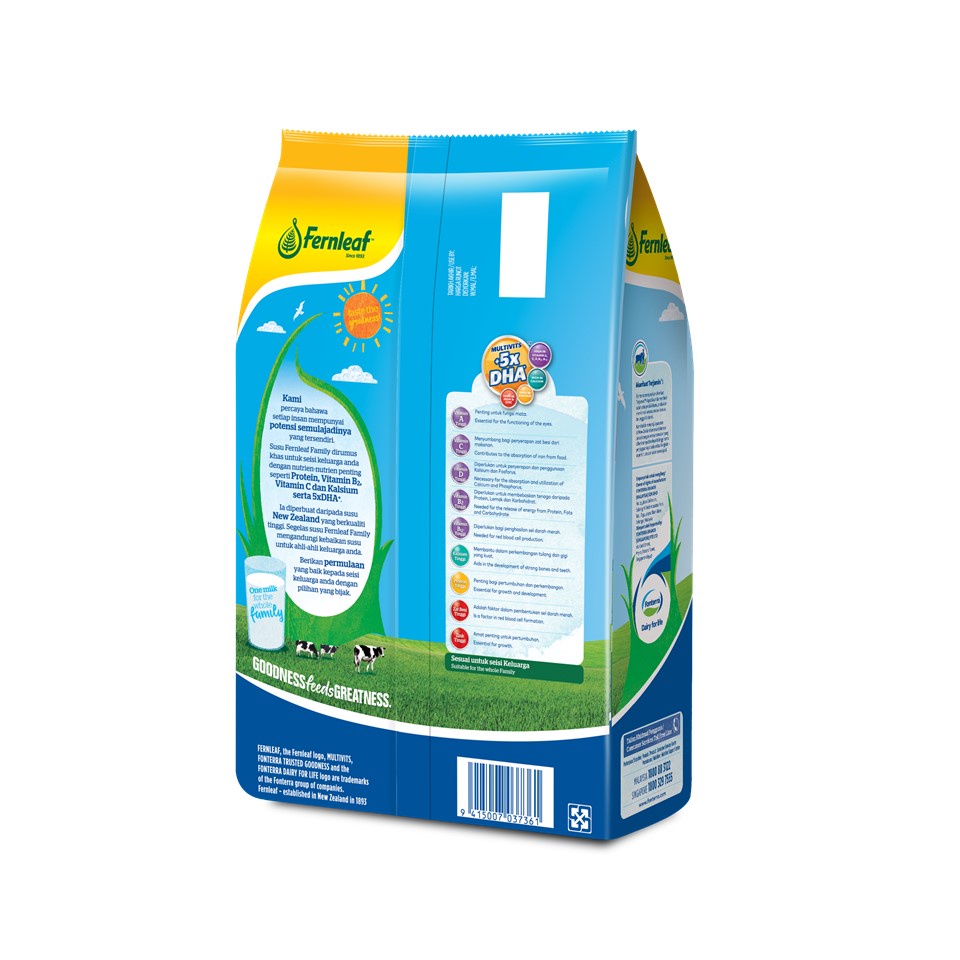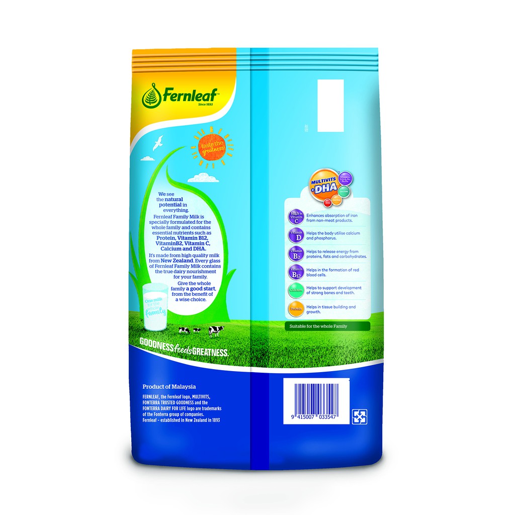 FERNLEAF FAMILY NUTRITIOUS MILK POWDER 550G - Kelokal.com FERNLEAF FAMILY NUTRITIOUS MILK POWDER 550G. Multi-vits + 5x DHA, With protein, iron and calcium, With vitamin A, C, D, B1, B2, B3, B12, 100% Milk from New Zealand, Reduced fat, Great nutrition, great value, Halal - Malaysia Family Nutritious Milk Powder. One Milk for the Entire Family.