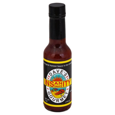 Daves Gourmet Sauce Hot Insanity - 5 Oz - Albertsons Shop Daves Gourmet Sauce Hot Insanity - 5 Oz from Albertsons. ... Sauce, Insanity The original hottest sauce in the universe! A great cooking ingredient for sauces, soups and stews. Also, strips waxed floors and removes driveway grease stains. ... Warning. Contains: Use this product one drop at a time. Keep away from eyes, pets and children ...