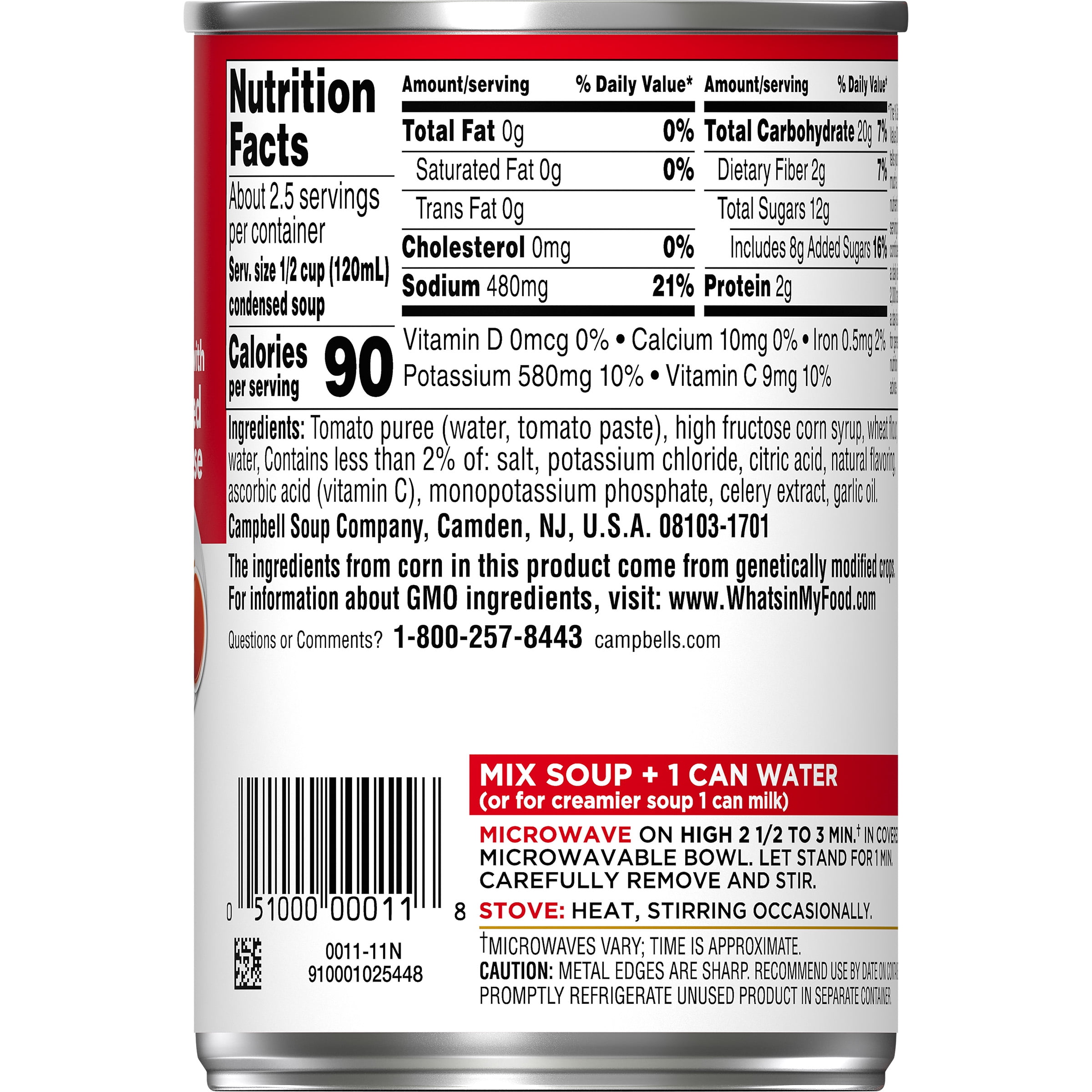 Campbell's® Classic Condensed Tomato Soup - Campbells Food Service Nutrition Facts: About 11 Servings Per Container: Serving size: 1/2 Cup (120mL) Condensed Soup: Amount per serving: Calories 90 % Daily Value *; Total Fat