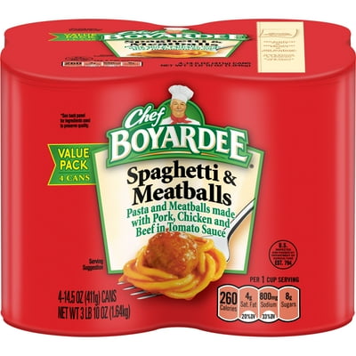 Spaghetti & Meatballs Can | Chef Boyardee Spaghetti & Meatballs Can. 3.3. (127) Write a review. Enjoy the Chef's famous-recipe pasta and meatballs in a signature tomato sauce. See ingredients, nutrition, and other product information here. Buy Now.