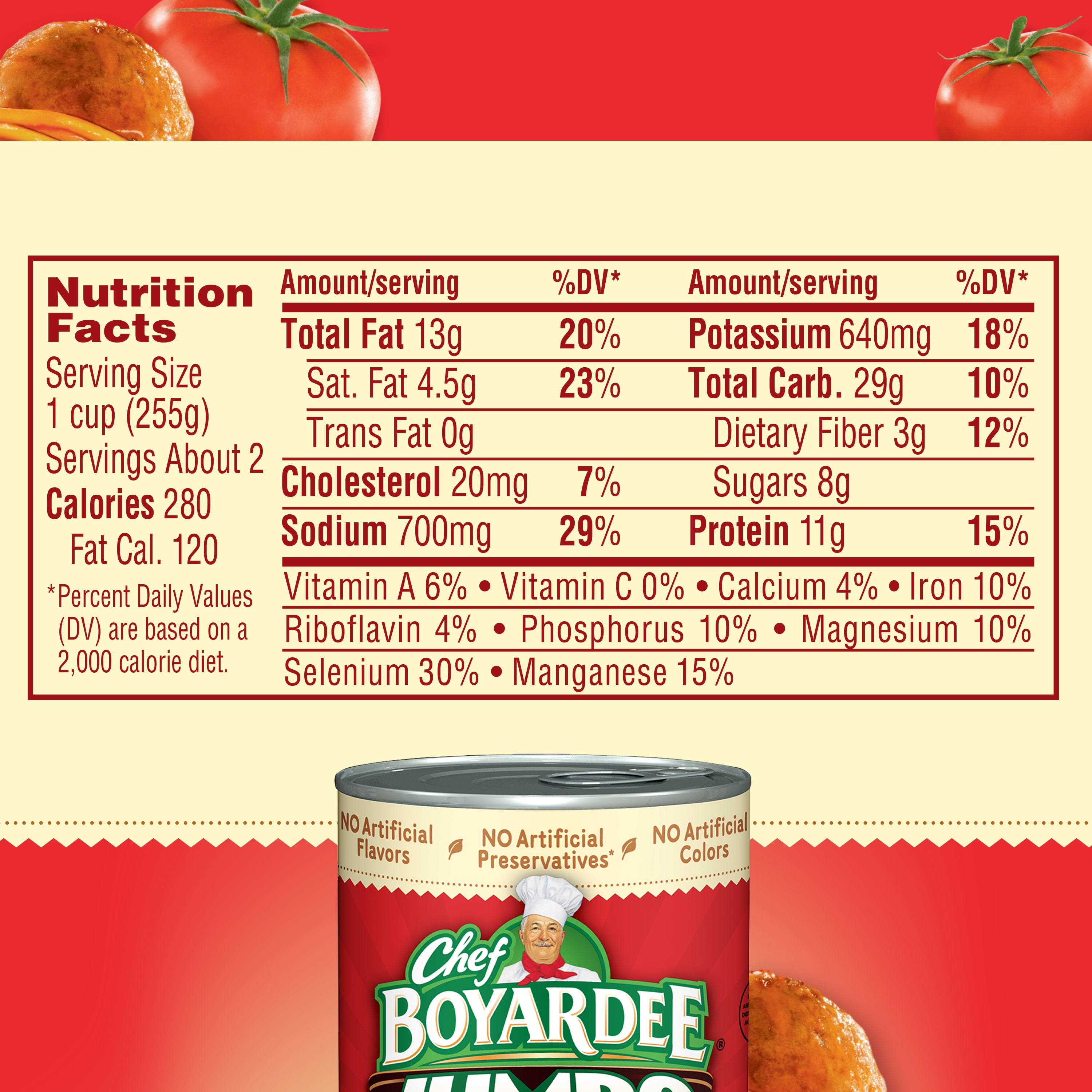 Canned & Microwave Spaghetti | Chef Boyardee Enjoy the tastes of Italy with delicious spaghetti and meatballs from Chef Boyardee. Satisfy your taste buds with this classic favorite tonight! Chef Boyardee® Spaghetti & Meatballs, 14.5 oz - Kroger Each 14.5 oz, easy-open can of Chef Boyardee Spaghetti and Meatballs contains: 2 servings of meatballs, pasta, and tomato sauce. 9 grams of protein. 260 calories per serving. With no artificial flavors, colors, or preservatives, Chef Boyardee makes a wholesome meal for kids of ALL ages. Chef Boyardee Spaghetti in Meat Sauce - Fooducate For women: 100 calories (25 grams, 6 tsp per day) For men: 150 calories (37 grams, 9 tsp per day) The FDA is more "generous", the Daily Value for added sugars is 200 calories (50 grams, 12 tsp per day). Here at Fooducate, we suggest sticking to the stricter option (only 25 grams per day for women, 37 grams for men). More info. Nutrition Facts for Chef Boyardee Spaghetti & Meatballs Protein 7g. 2% Calcium 20mg. 8% Iron 1.4mg. 6% Potassium 270mg. 4% Vitamin A 36mcg. 0% Vitamin C 0mg. *. The % Daily Value (DV) tells you how much a nutrient in a serving of food contributes to a daily diet. 2,000 calories a day is used for general nutrition advice. 21 Net Carbs Per Serving.