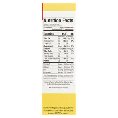 Popcorn Food Label - This Nutrition Skinnypop Popcorn Food Label But, Americans get maximum of their sodium from bread, bird, and pizza. About half of our meals agencies right here have trans fats, either evidently or artificially introduced or created. Calories in Skinny Pop Popcorn and Nutrition Facts - FatSecret Skinny Pop Popcorn Nutrition Facts Serving Size 1 cup (8 g) Amount Per Serving Calories 39 % Daily Values* Total Fat 2.32g 3% Saturated Fat 0.200g 1% Trans Fat 0.000g Polyunsaturated Fat 0.000g Monounsaturated Fat 0.000g Cholesterol 0mg 0% Sodium 12mg 1% Total Carbohydrate 3.50g 1% Dietary Fiber 0.8g 3% Sugars 0.00g Protein 0.78g Vitamin D - SkinnyPop Butter Microwave Popcorn - Shop Snacks & Candy at H-E-B 1.00 cup (32g unp) *Percentage Daily values are based on a 2,000 calorie diet.Your Daily values may be higher or lower depending on your calorie needs we recommend SkinnyPop Sea Salt Microwave Popcorn, 6 ct $4.99 each ($0.84/ct) SkinnyPop Original Popcorn Sharing Size, 6.7 oz $4.81 each ($0.72/oz) SkinnyPop White Cheddar Popcorn , 6.7 oz
