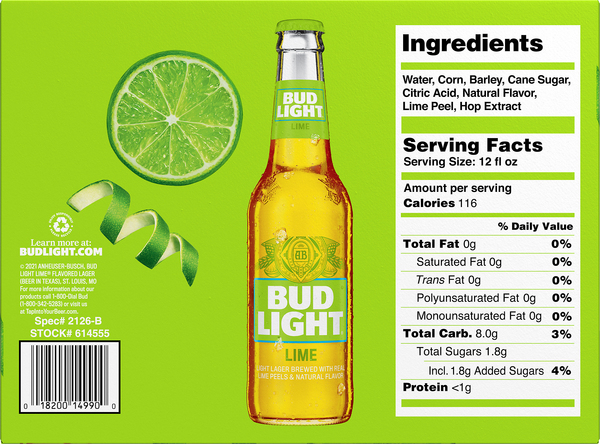 Bud light lime calories. Bud Light Lime ABV Calories and Alcohol Content Percentage The beer Bud Light Lime calories are 116 grams with contains ABV of 4.2% Knowing the Alcohol Content of Bud Light Lime is necessary before you take a sip. The Budweiser introduced this beer advertising as a refreshing lime drink, but according to critics it is infused with chemical contrived and is more of a carbonated fruit beverage which is neither actually alcoholic not is it any fruit juice. Bud Light Lime Calories - This Nutrition Aug 8, 2022 · A can of Bud Light has about 110 calories and 6.6 grams of carbohydrates, while a can of Bud Light Lime has about 116 calories and 8 grams of carbohydrates. Bud Light. Did you catch Bud Light's recent makeover? While the packaging underwent a facelift, the contents of the beer itself remained the same. Each can or bottle has 116 calories, 6.6-8 grams of carbs, and 0.9 grams of protein. Is there sugar in Bud Light Lime? Bud Light: 4.6 grams of carbs, 0 grams of sugar. Can I drink Bud Light on ... Bud Light | Easy To Drink | Easy To Enjoy Bud Light Blue. We carefully brew our beer to be perfect for anywhere there's fun because when there's fun, there's a Bud Light there. Every bottle, can and draft of Bud Light uses four simple, high quality ingredients to create a clean, crisp taste. Details Find Near You. Bud Light Lime Calories, Carbs & Nutrition Facts | MyFitnessPal Bud Light Lime Serving Size: 1 fl oz 116 Cal 94% 8g Carbs 0% -- Fat 6% 0.5g Protein Track macros, calories, and more with MyFitnessPal. Join for free! Daily Goals How does this food fit into your daily goals? Calorie Goal 1884 Cal 116/2000Cal left Fitness Goals: Heart Healthy Fat 67 g --/67g left Sodium 2300 mg --/2300mg left Cholesterol 300 mg