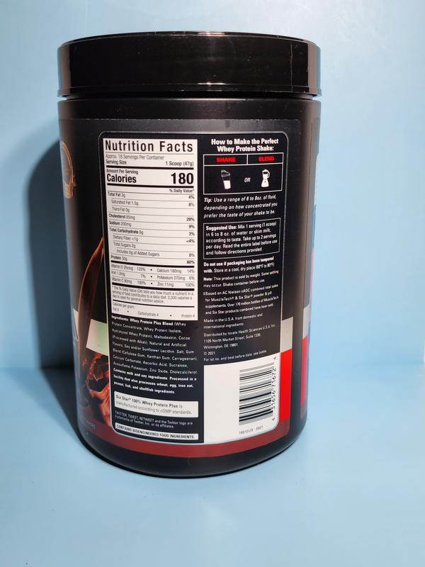 Carbs in Muscletech Six Star 100% Whey Protein Triple Chocolate Muscletech Six Star 100% Whey Protein Triple Chocolate (1 scoop) contains 8g total carbs, 7g net carbs, 3g fat, 30g protein, and 180 calories. Whey Protein Chocolate - Six Star - 907g Feb 10, 2022 ... NON-MEDICINAL INGREDIENTS: Whey Protein Plus Blend[(Whey Protein Concentrate, 97% Whey Protein Isolate, WheyProtein Isolate, Hydrolyzed Whey ...