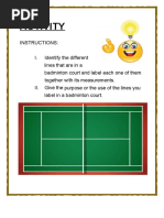 Copy and label the parts of the court of badminton. What are the parts of badminton court? | Dependable Midcourt - The middle third of the court, halfway between the net and the back boundary line. Net Shot - Shot hit from the forecourt that just clears the net and drops sharply. Push Shot - Gentle shot played by pushing the shuttle with little wrist motion, usually from net or midcourt to the opponent's midcourt. the badminton court - StudyRes THE BADMINTON COURT Included below is a diagram of a badminton court. Do not worry about learning the court dimensions (the measurements) but do use this resource to familiarize yourself with the lines of a badminton court. Notice the lines used when playing and the lines used when playing doubles. ... On a blank badminton court diagram you ... Parts of a Badminton Racket - SportsRec The body of the racket itself is called the frame. It consists of the head, the stringed area, the throat, the shaft and the handle. According to BWF laws, the length of the frame should be no longer than 680 millimeters or wider than 230 millimeters. The weight of a fully strung frame should be within 80 and 100 grams. Badminton Facilities - Topend Sports The net line marks the middle of the court where the net is placed, creating a 22 feet by 20 feet area on each side of the net. The Badminton Net. The top of the badminton net is hung 5 feet above in the center net line. Short Service Line. The short service line is marked 6 feet 6 inches from the center line.