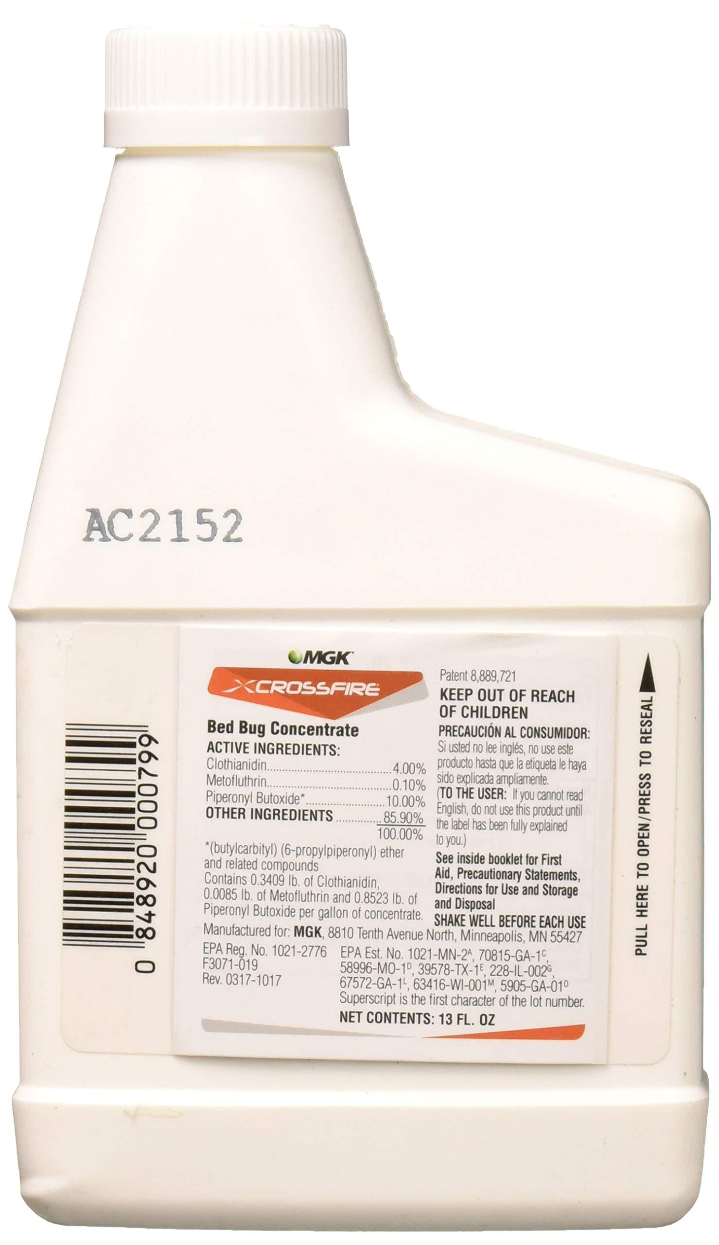 MGK 1852 Crossfire Concentrate 13oz Insecticide, 13 oz, Clear CrossFire Bed Bug Concentrate 13oz . SHAKE WELL BEFORE EACH USE. FOR INDOOR USE ONLY. Crossfire is the next generation insecticide which effectively kills Bed Bugs in both residential and commercial buildings and structures. Crossfire patented technology provides residual control for up to four weeks after application and is scientifically ...