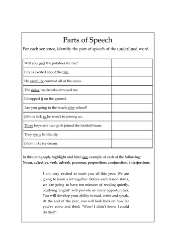 Lesson Plan: Label Sentences with Parts of Speech - ThoughtCo This lesson plan focuses on helping beginning level classes develop a strong grasp of four parts of speech: nouns, verbs, adjectives, and adverbs. Once students become familiar with common structural patterns using these four key parts of speech, they feel more confident as they begin to explore the different tenses. Lesson Characteristics