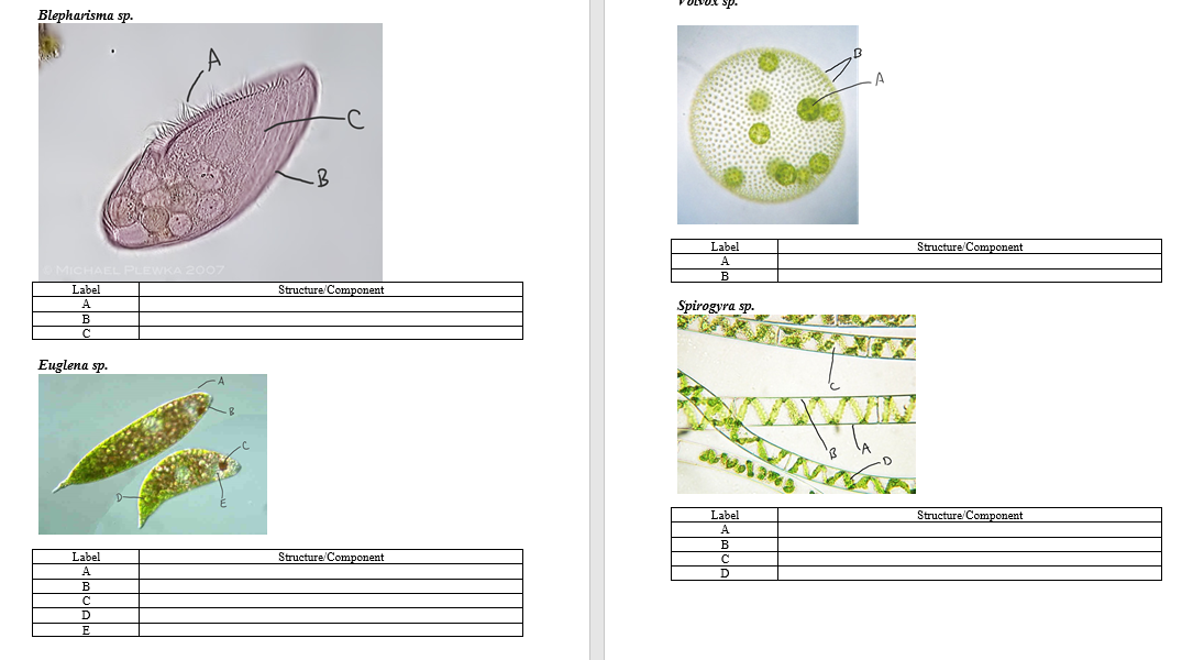 Algae lab - The Biology Corner LABEL the chloroplasts, cell membrane (pellicle) and the eyespot. Observe Spirogyra & Volvox . 8. View a slide of spirogyra under scanning, low power, and high power. On one filament of spirog yra, estimate how many cells are present: _____ 9. Sketch the spirogyra. LABEL the chloroplasts and the cell wall. 10.